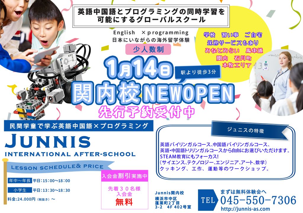 2025年1月14日(火)開校決定 2024 12/20 Uncategorized 2024-12-20 英語中国語とプログラミングを同時に学べる学童保育Junnis International After-schoolを2025年1月14日開校を決定しました。1月14日以後の体験レッスンのご予約も開始しました。 Uncategorized